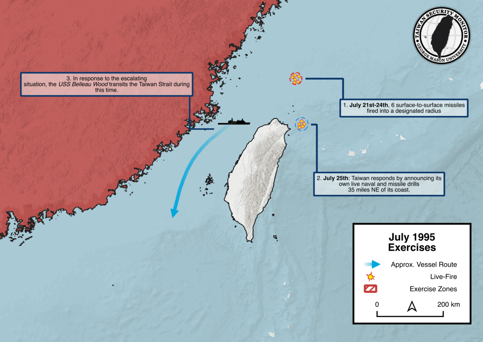 1995年,李登辉以台湾总统身份首次访美,北京方面做出强烈反应,在台湾海峡和台湾周围试射导弹、实弹演习,这是第一波。1996年3月台湾大选前,中国解放军再次试射导弹、演习,威慑台湾,这是第二波。彼时,美国派遣“独立号”航空母舰战斗群去台湾东北海域,随即又从波斯湾调遣“尼米兹号”航空母舰战斗群开往台湾东部海域。